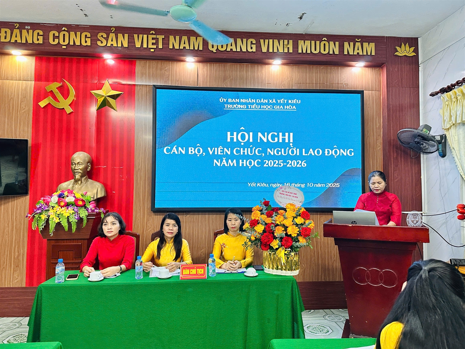 Sau một buổi làm việc khẩn trương, nghiêm túc và hiệu quả, Hội nghị cán bộ, viên chức và người lao động Trường Tiểu học Gia Hòa năm học 2025 – 2026 đã thành công tốt đẹp. Hội nghị biểu thị sự thống nhất cao về mục tiêu, phương hướng, giải pháp thực hiện nhiệm vụ năm học, đồng thời thể hiện quyết tâm của tập thể sư phạm nhà trường trong việc phấn đấu hoàn thành tốt nhiệm vụ được giao, tiếp tục khẳng định vị thế là một trong những đơn vị vững mạnh toàn diện của ngành giáo dục địa phương.