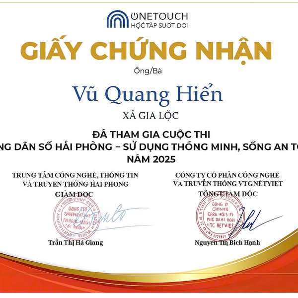 Sau đây là một số giấy chứng nhận của cán bộ, giáo viên, nhân viên Trường Tiểu học Gia Lương đã tích cực tham gia Cuộc thi “Công dân số Hải Phòng - sử dụng thông minh, sống an toàn”: