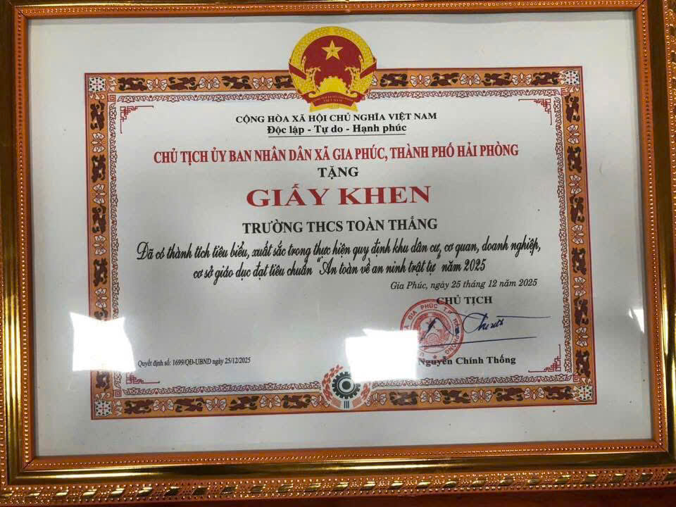 Sáng ngày 11/02/2026, Trường THCS Toàn Thắng được Chủ tịch UBND xã Gia Phúc trao tặng Giấy khen vì đã có thành tích tiêu biểu, xuất sắc trong thực hiện quy định xây dựng khu dân cư, cơ quan, doanh nghiệp, cơ sở giáo dục đạt tiêu chuẩn “An toàn về an ninh trật tự” năm 2025.