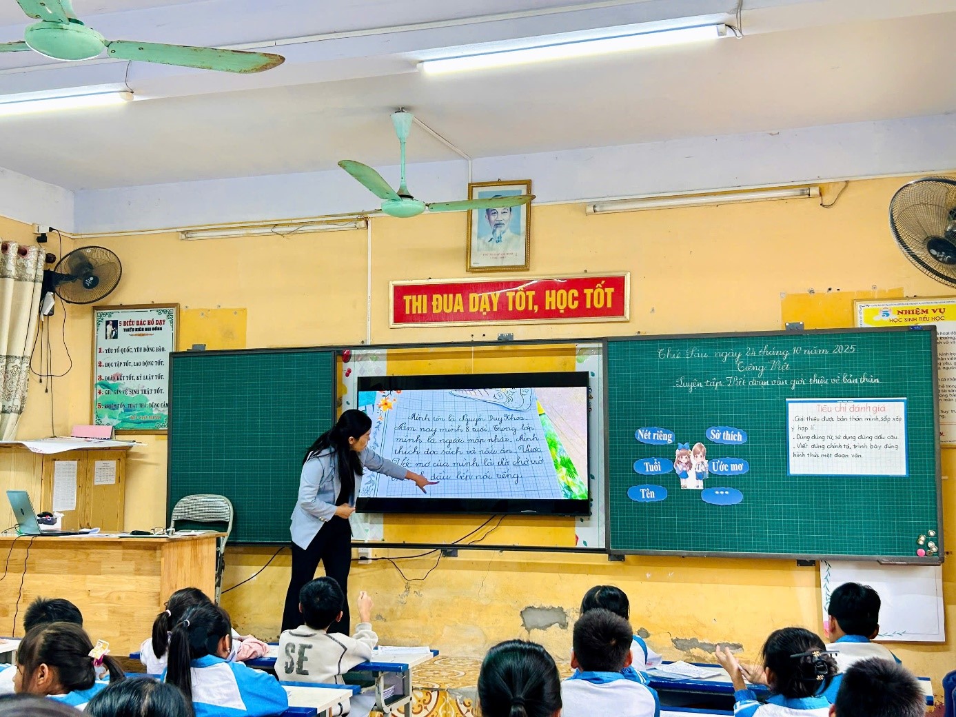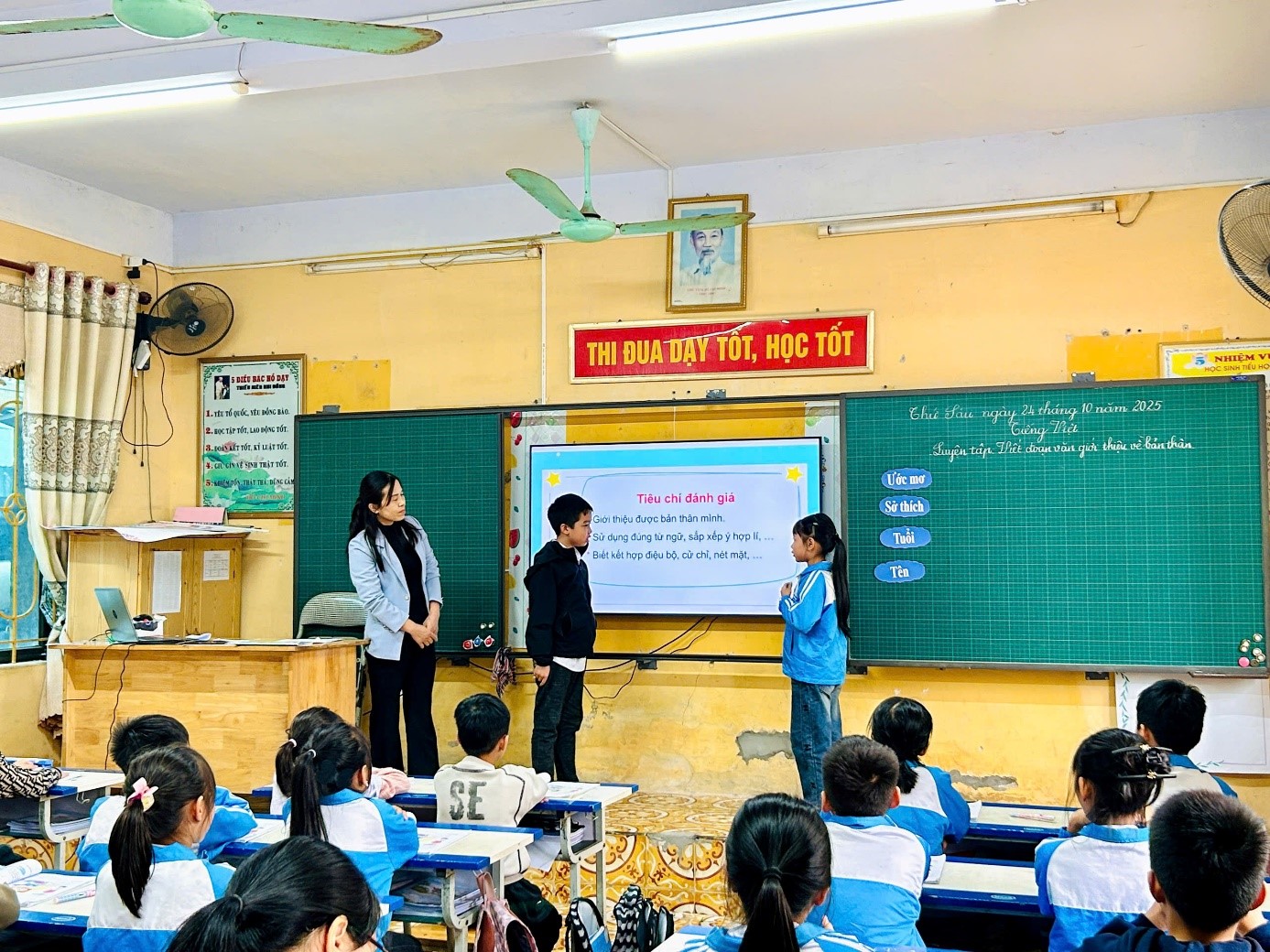 Tiết dạy minh họa chuyên đề với bài học “Viết đoạn văn giới thiệu về bản thân” do cô giáo Đoàn Hải Duyên giảng dạy tại lớp 3A đã diễn ra sôi nổi và hiệu quả. Trong tiết học, cô Đoàn Hải Duyên đã vận dụng linh hoạt các phương pháp dạy học tích cực, hướng dẫn học sinh thảo luận, chia sẻ về tên, tuổi, sở thích và ước mơ của mình. Những nét hồn nhiên, đáng yêu của học trò hiện lên qua từng lời giới thiệu: bạn thích vẽ tranh, bạn say mê đọc sách, bạn lại yêu thích tiếng Anh… Nhiều học sinh tự tin viết và trình bày đoạn văn của mình trước lớp, thậm chí có em còn giới thiệu bản thân bằng tiếng Anh, tạo nên không khí học tập hào hứng, vui tươi.