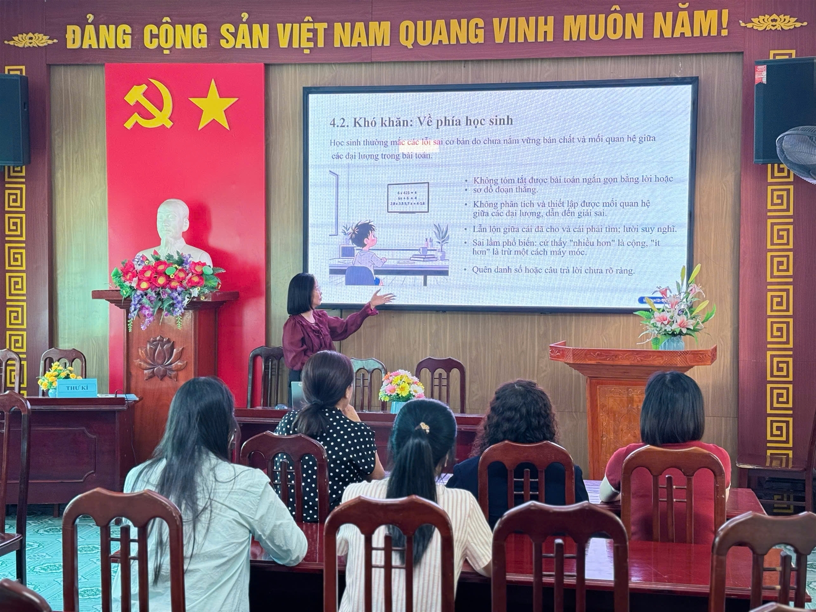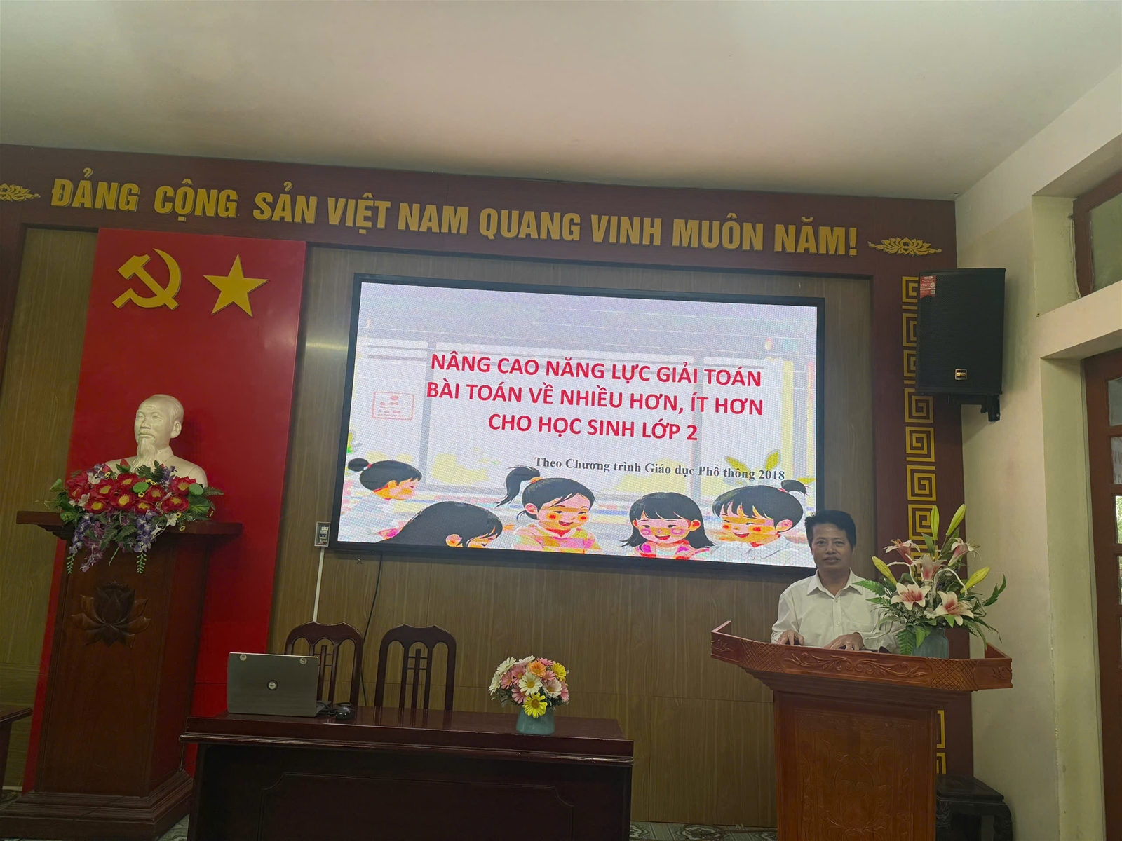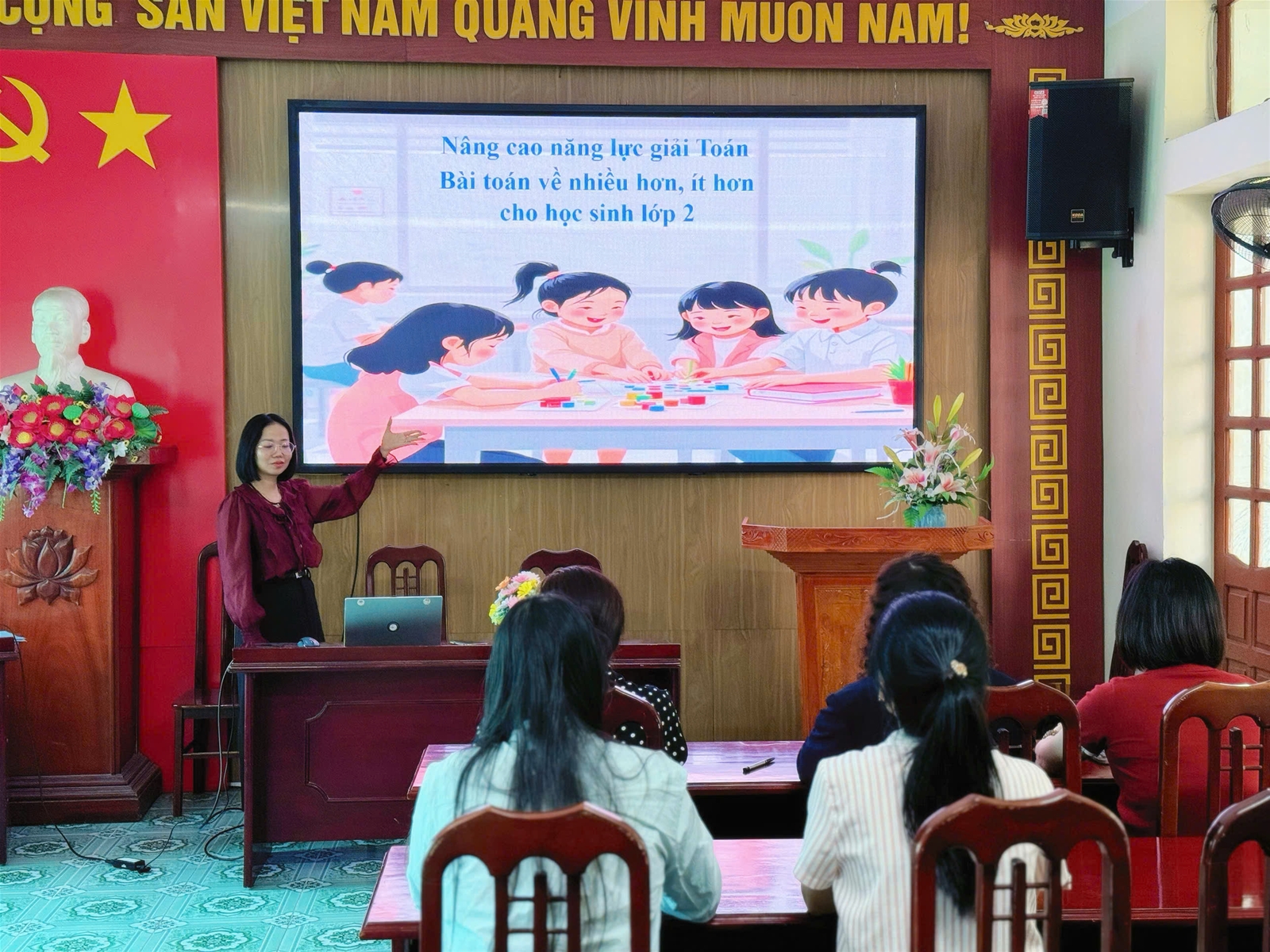 Buổi sinh hoạt chuyên đề được tổ chức trong không khí cởi mở, thân thiện, với sự tham dự của Ban giám hiệu nhà trường, các giáo viên trong tổ chuyên môn. Bản báo cáo lý thuyết của cô giáo Đặng Thị Huyền trình bày đã nêu rõ ý nghĩa, mục tiêu, cơ sở lý luận và các biện pháp giúp học sinh nắm chắc dạng toán “nhiều hơn – ít hơn”. Nội dung báo cáo đã làm nổi bật tầm quan trọng của việc rèn kỹ năng đọc hiểu đề toán, xác định mối quan hệ giữa các đại lượng  trong đề toán và cách hướng dẫn học sinh giải toán bằng cách lựa chọn phép tính phù hợp, qua đó phát triển tư duy logic và khả năng giải quyết vấn đề  cho học sinh.