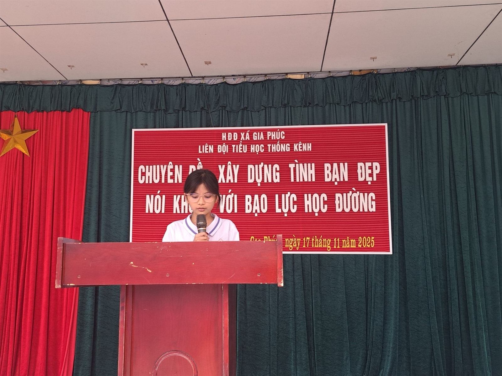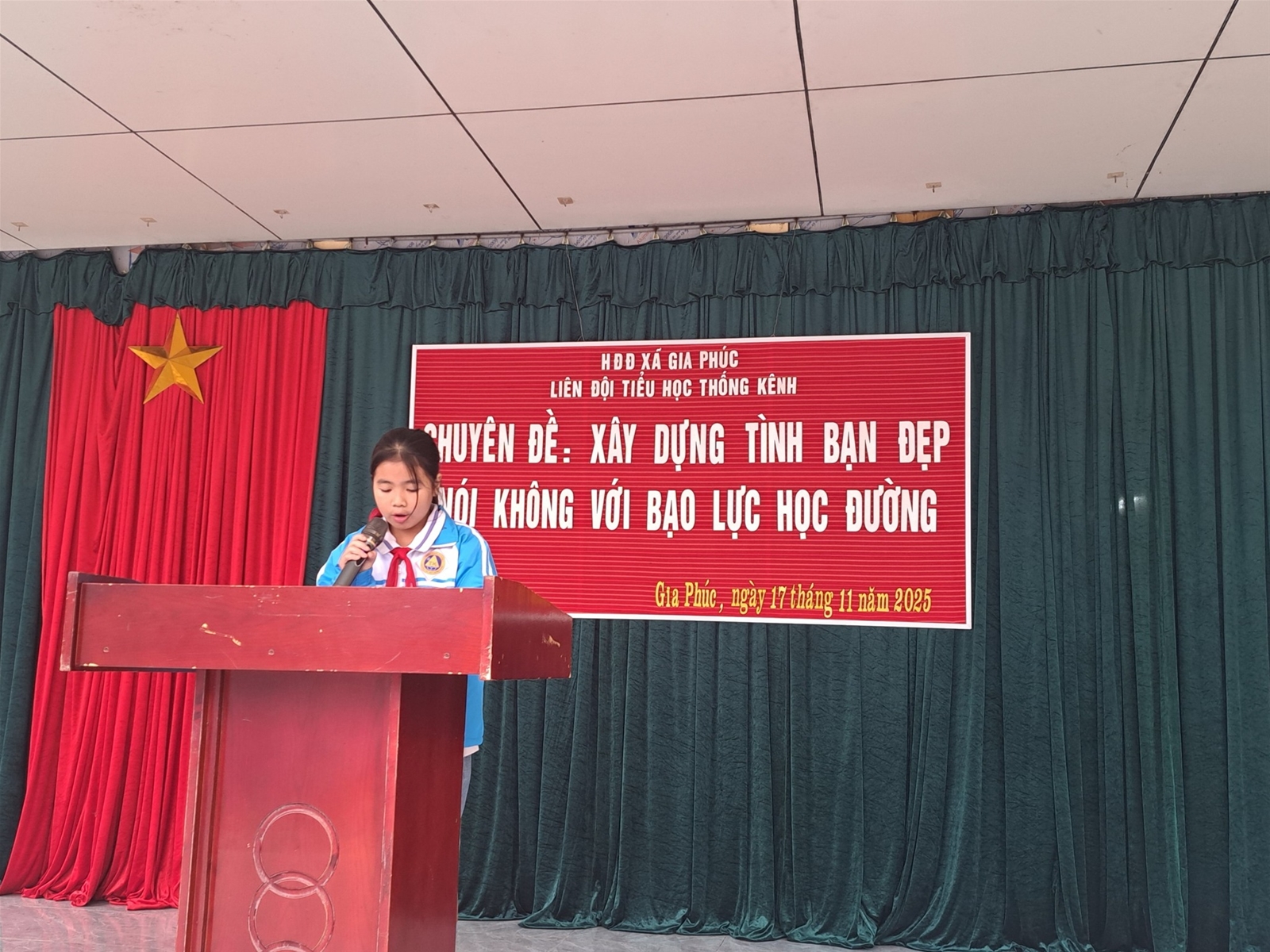 Thực hiện chương trình công tác Đội và phong trào Thiếu nhi năm học 2025–2026, sáng ngày 17/11/2025, Liên đội TH Thống Kênh đã tổ chức chuyên đề “Xây dựng tình bạn đẹp – Nói không với bạo lực học đường” dành cho các em đội viên, nhi đồng.