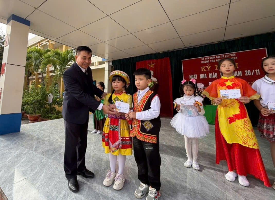 Thầy Hoàng Sách Khôi - Bí thư Chi bộ - Hiệu trưởng trao giải thưởng cho các tiết mục đạt giải của hội thi “ Giai điệu tuổi thơ”.