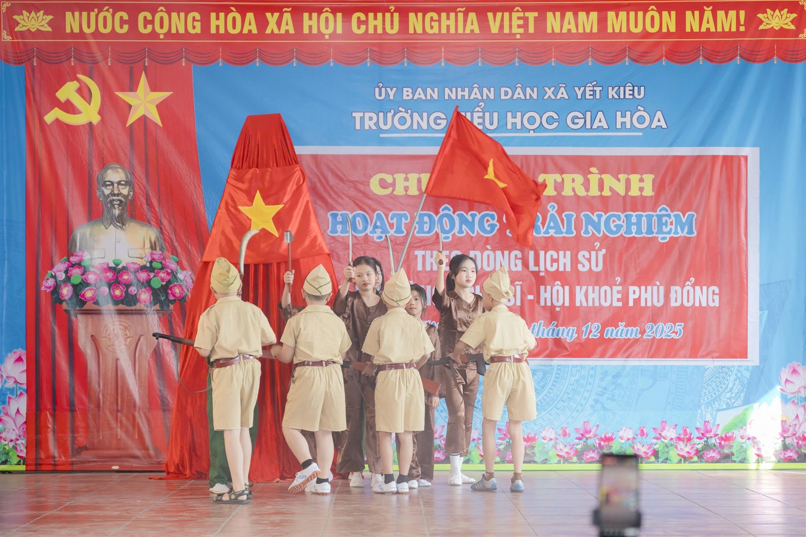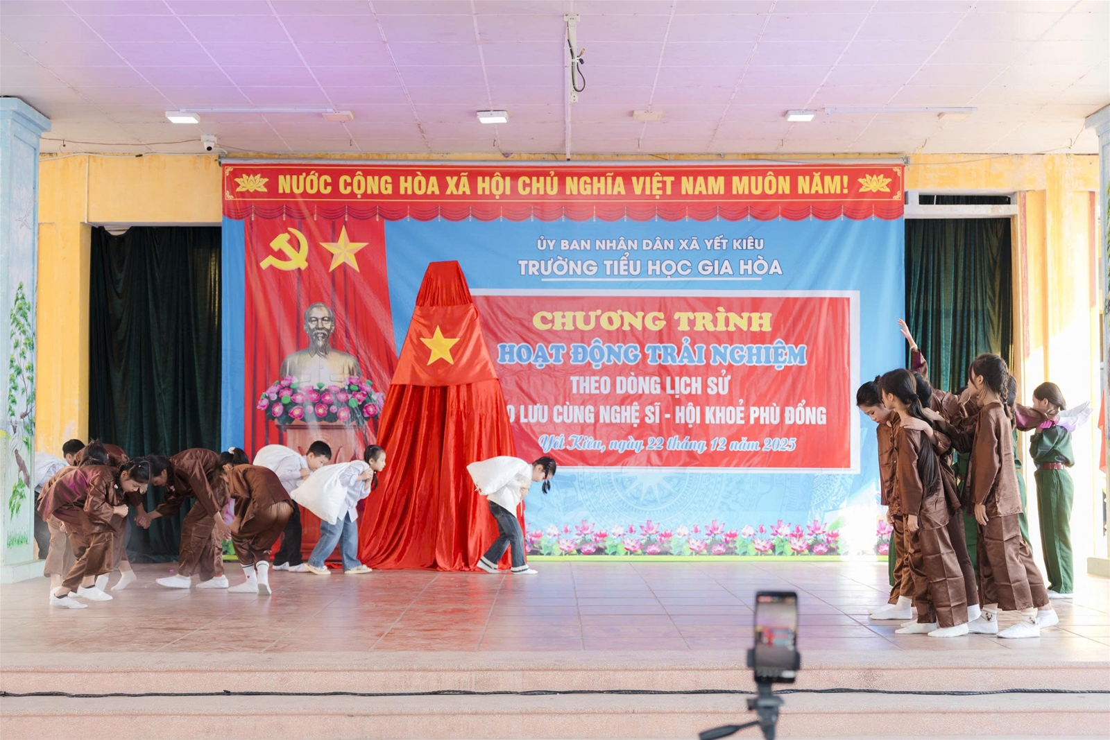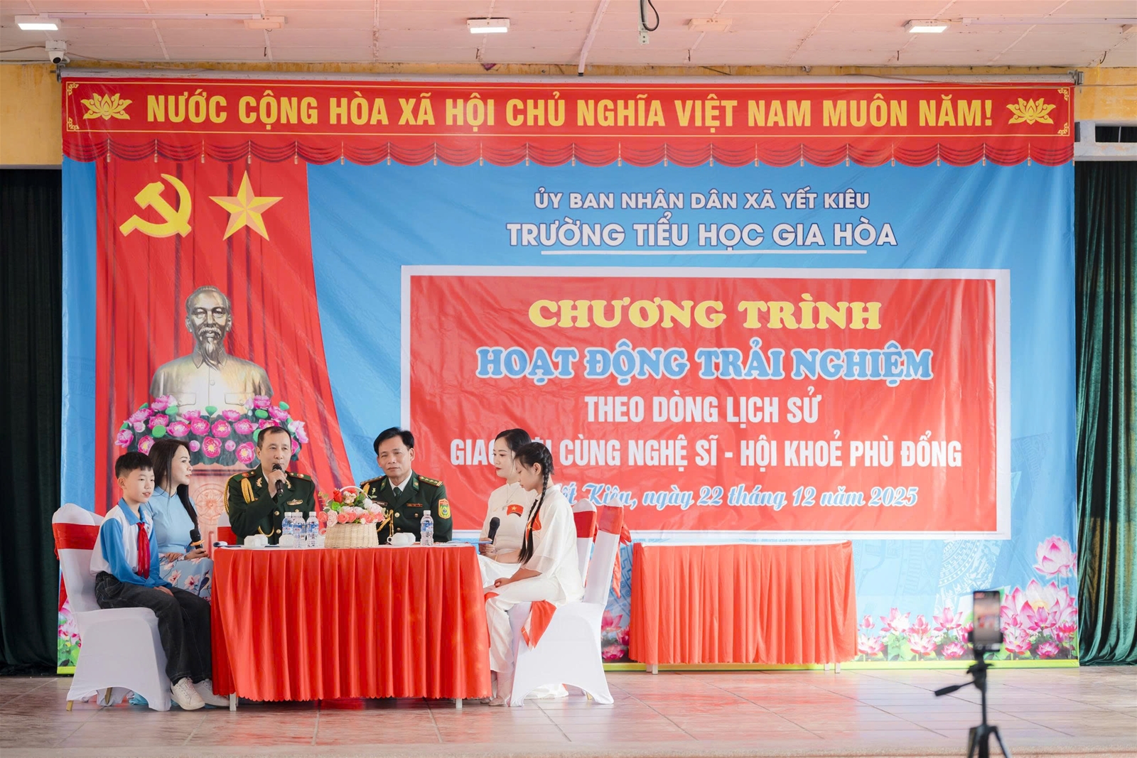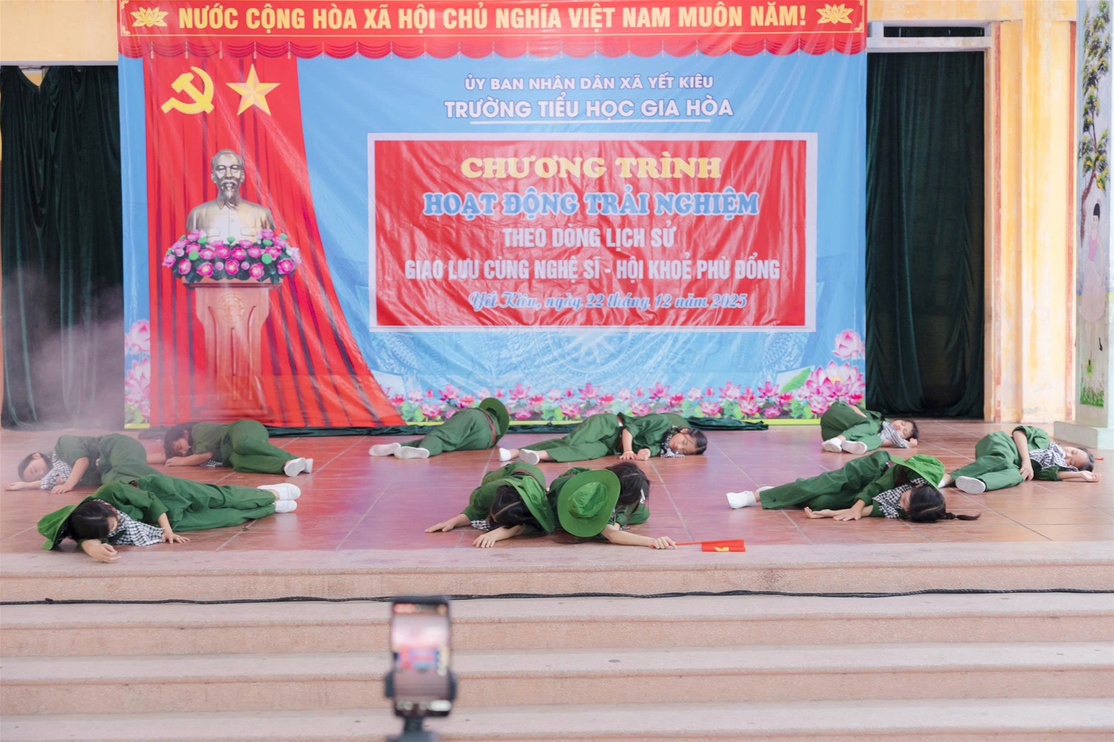 Sáng ngày 22/12/2025, Trường Tiểu học Gia Hòa, xã Yết Kiêu, thành phố Hải Phòng tổ chức chương trình Hoạt động trải nghiệm với chủ đề “Theo dòng lịch sử – Giao lưu cùng nghệ sĩ – Hội khỏe Phù Đổng”, nhằm thiết thực chào mừng kỷ niệm Ngày thành lập Quân đội Nhân dân Việt Nam 22/12 và giáo dục truyền thống yêu nước cho học sinh.
