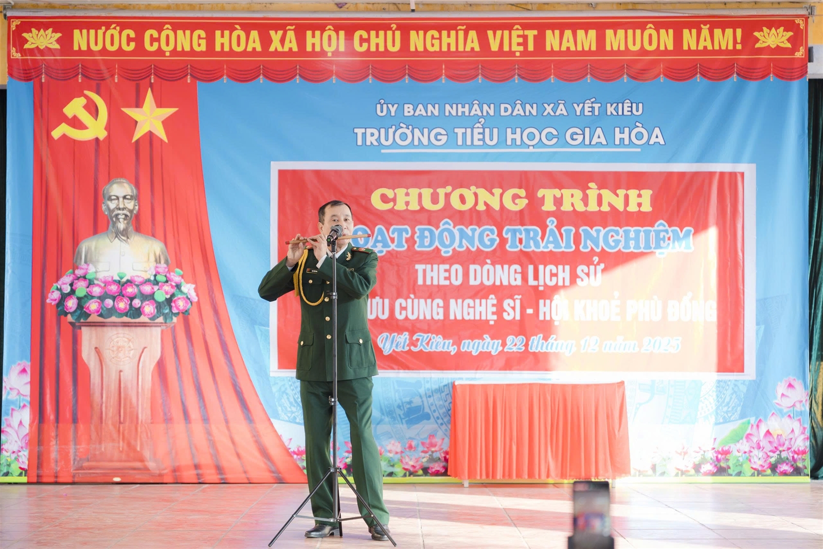 Tại chương trình, hai nghệ sĩ đã mang đến những tiết mục độc tấu giàu cảm xúc: sáo trúc “Anh vẫn hành quân”, đàn bầu “Cung đàn đất nước”, cùng màn hòa tấu “Việt Nam quê hương tôi”. Những giai điệu mộc mạc, réo rắt của nhạc cụ dân tộc đã tạo nên không gian nghệ thuật sâu lắng, giúp học sinh hiểu hơn về vẻ đẹp của văn hóa Việt. Bên cạnh đó, các nghệ sĩ chia sẻ nhiều câu chuyện nghề, chuyện đời ý nghĩa về hành trình giữ gìn âm nhạc truyền thống và phẩm chất Bộ đội Cụ Hồ trong thời đại mới, truyền cảm hứng mạnh mẽ tới các em học sinh.