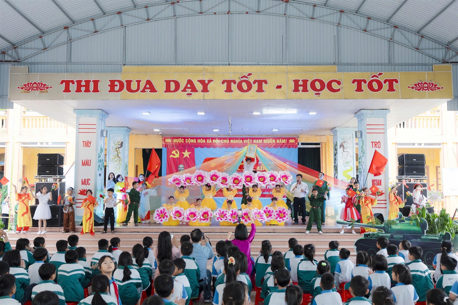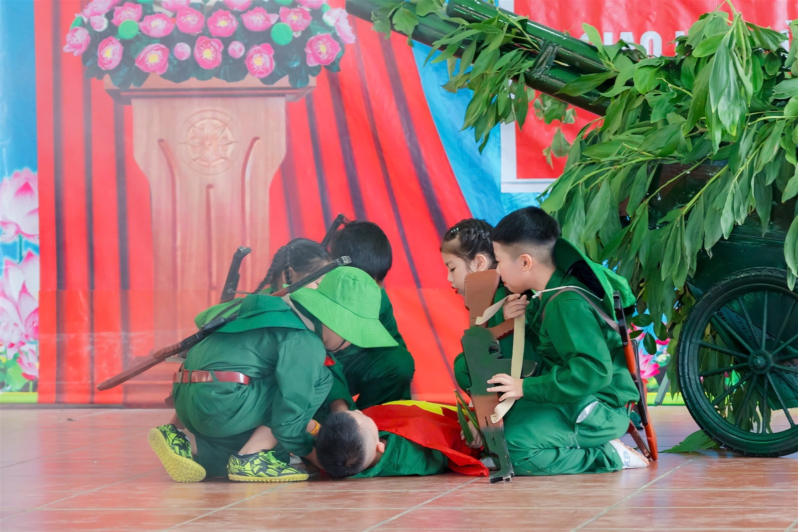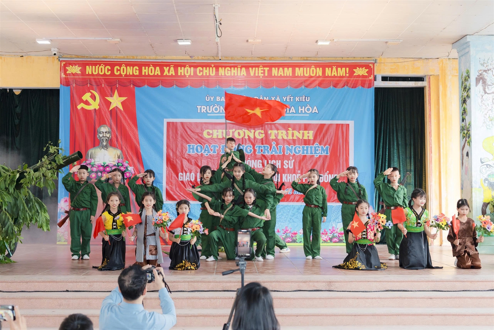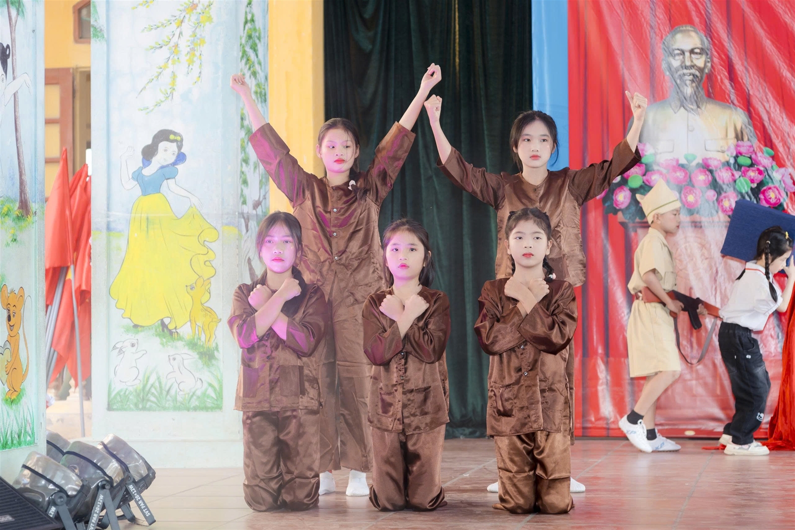 Sau phần giao lưu, các khối lớp tiếp tục trình diễn chuỗi hoạt cảnh lịch sử được dàn dựng công phu: Người đi tìm hình của nước, Cách mạng Tháng Tám, Điện Biên Phủ – vang mãi bản hùng ca, 10 cô gái Ngã ba Đồng Lộc, Đại thắng mùa Xuân 1975, cùng tiết mục “Như có Bác Hồ trong ngày vui đại thắng”. Mỗi hoạt cảnh là một lát cắt sinh động của lịch sử, giúp học sinh tiếp cận kiến thức bằng trải nghiệm trực quan, hấp dẫn. Chương trình hoạt động trải nghiệm “Theo dòng lịch sử” không chỉ giúp học sinh ôn lại những mốc son hào hùng của dân tộc, mà còn bồi đắp tình yêu quê hương, niềm tự hào và ý thức trách nhiệm trong mỗi em.