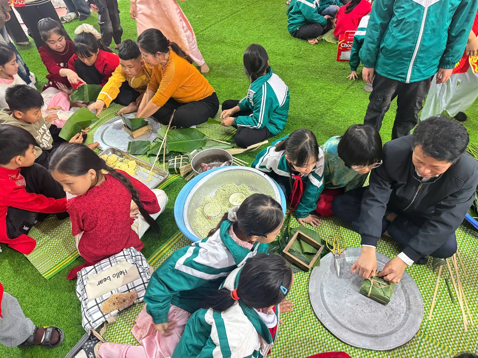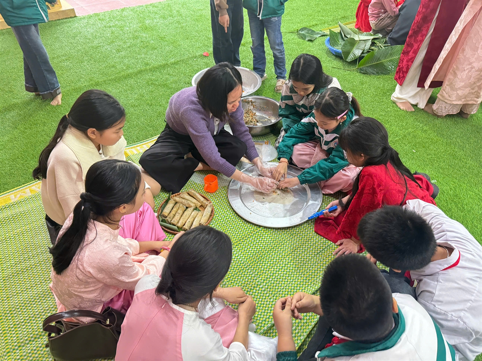 Không gian văn hóa Tết cổ truyền được tái hiện sinh động với chuỗi hoạt động trải nghiệm mang đậm bản sắc dân tộc. Học sinh được trực tiếp tham gia rửa lá dong, chuẩn bị nguyên liệu và gói bánh chưng, qua đó hiểu hơn về ý nghĩa của món bánh truyền thống trong ngày Tết cổ truyền Việt Nam. Bên cạnh đó, các em còn được trải nghiệm làm nem, tìm hiểu quy trình chế biến các món ăn ngày Tết và cảm nhận không khí sum vầy, đoàn viên.