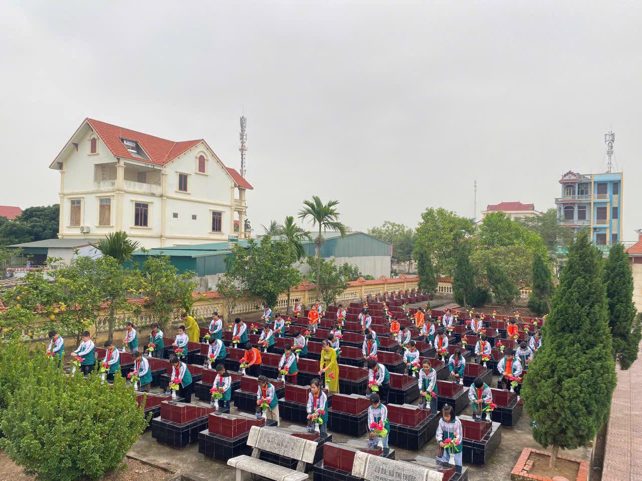 Sau khi dâng hương, các em cùng nhau quét dọn vệ sinh đài tưởng niệm. Công việc được tiến hành với tinh thần tích cực, khẩn trương. Các em học sinh tự giác toả ra các khu vực trong khuôn viên nghĩa trang để nhổ cỏ, quét rác. Một không khí làm việc chan hòa, ấm áp.